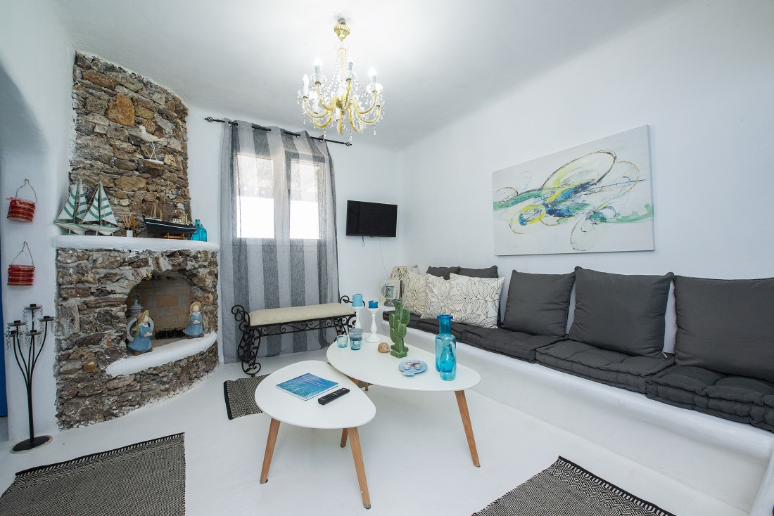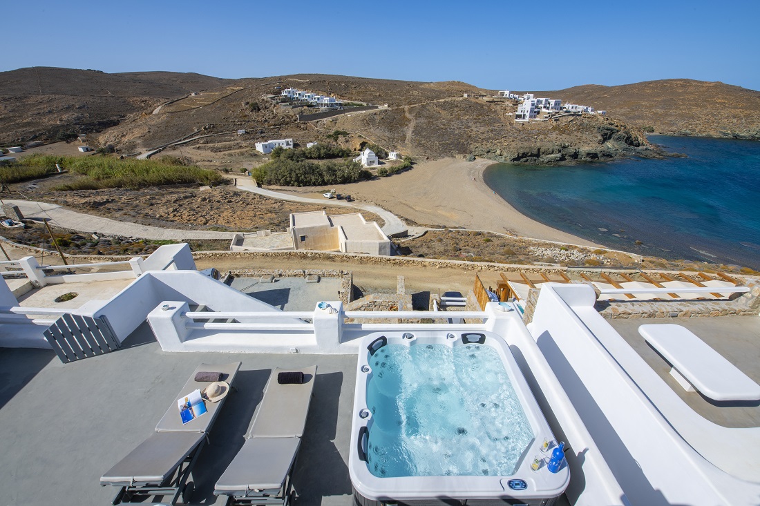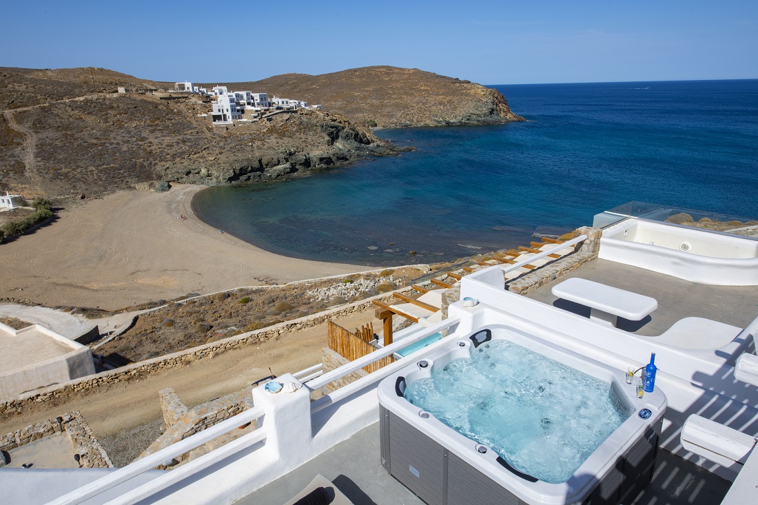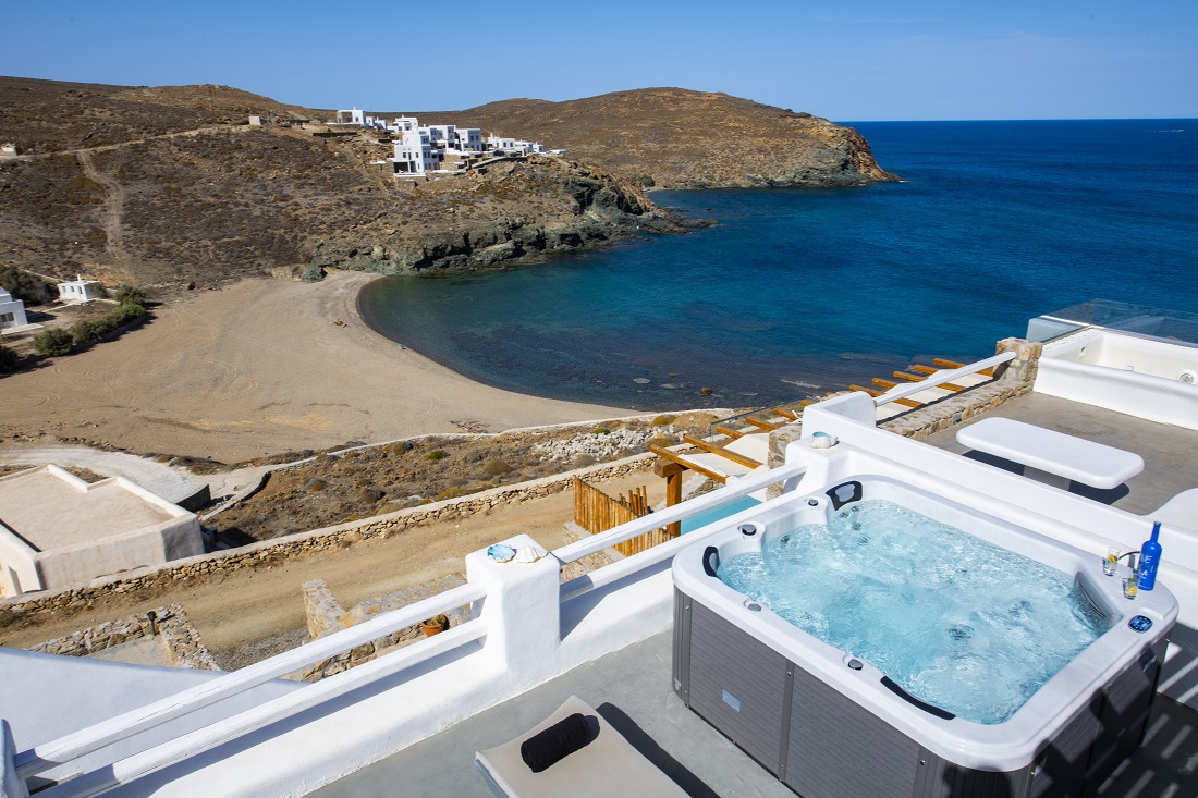 This is a 120m2 beachfront residence with view to the Aegean Sea and hot tub on the veranda overlooking the sea. The house is located in Merhia Bay, a beautiful private bay, 50 meters from the sea, very close to the road network of the area, while preserving its autonomy and quietness. The residence includes two bedrooms, two double bed bedroom & one with 2 single beds bedroom, and two Cycladic-style style bathrooms. On the front side of the house there is a fully equipped veranda with view to the Aegean Sea where guests can enjoy their breakfast or dinner or even sunbathing. Inside the house there is a large modern living room and a dining room. It has kitchen utensils and all kinds of sheets, pillows, blankets, etc. are provided. There is private parking space.